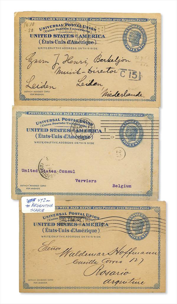 1893-1956, Selection of Message/Reply Cards to and from Foreign Destinations (Scott UY2//UY16), appealing group of 20 cards with six uprated, with better including ten examples of #UY2r; destinations include Australia (2), Germany, England, Netherlands, Belgium, Argentina (2), and Salvador, while cancels on incoming cards include Germany, Honduras, US German Seapost, Vatican City, etc.; some usual light wear from use, a Fine group. (PDF for this Lot) (Image)