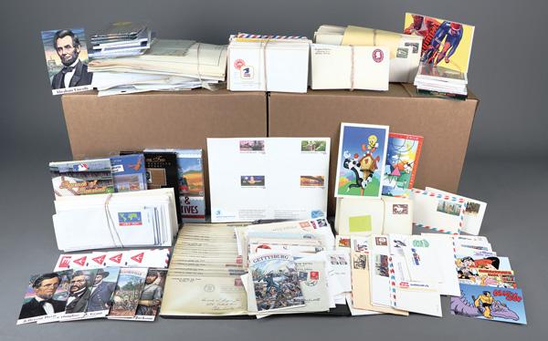 Mint Postal Stationery Hoard & Some Postal History, a partially organized collection of mostly mint stationery and postcards, including some nice postal history items; strength in the thousands of USPS sealed postcard packs and mint postal stationery, including such topics as American Dolls, Baseball Greats, Deep Sea Creatures, Movie Monsters, Trains, The '89 World Stamp Expo and Comic Strip Classics; a potentially rewarding lot with profit potential; we highly recommend this lot be viewed in person. Shipping charges apply - weight 88 lbs. (PDF for this Lot) (Image)