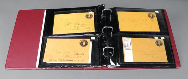 2¢ Entire Collection, 1863-64, collection of 32 postally used entires (U46//U56, W57) selected for smaller town use in a G&K binder; some scarcer die types present (UPSS values to $70) and a great wrapper; good specialist lot, Fine to Very Fine. Shipping charges apply - weight 1.8 lbs. (Video for this lot) (Image)