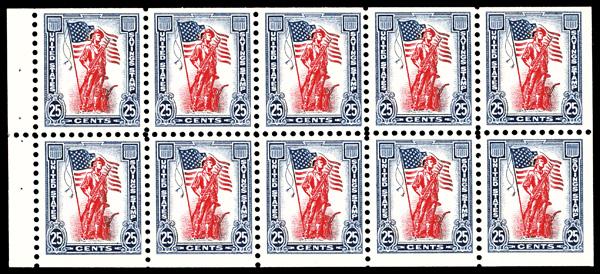 Savings Stamp, 1961, 25¢ dark blue & carmine (Scott S7a), booklet pane of 10, o.g., never hinged, pristine on bright white paper; interleaving accompanies, Very Fine. Scott $300. (Image)