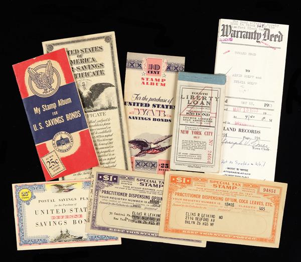 Holding of War Savings Stamps & Other Curiosities, 1918-53, A few War Savings stamp booklets, the highlight of which is one fully-filled with 20 copies of #WS2; other items of interest include a warranty deed from 1953 affixed with a pair R610 and other denominations, two large-sized internal revenues from the 1940s for the "Practitioner Dispensing Opium, Coca Leaves, etc., and a New York Liberty Loan Bond booklet, the first four pages affixed with a $2 loan stamp printed by the American Bank Note Co, overall Fine to Very Fine, additional images online. (PDF for this Lot) (Image)
