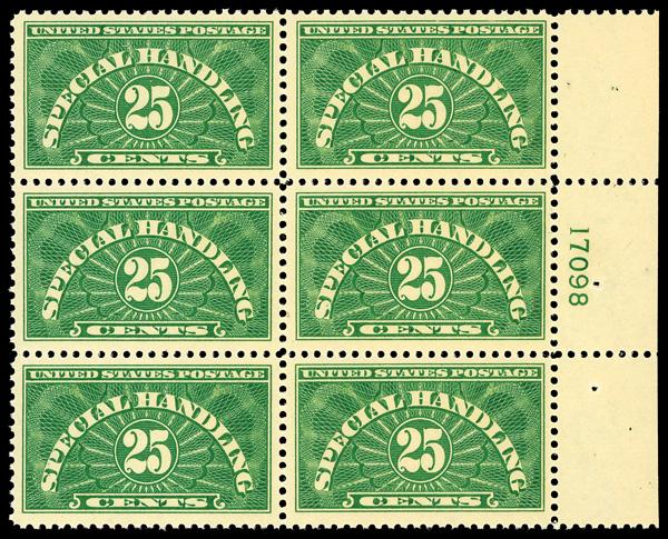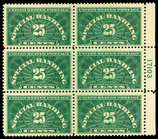 Special Handling, 1925, 25¢ deep green, "A" & 2nd "T" of "States" joined at top (Scott QE4 var.), right margin plate number 17103 block of 6, o.g., hinged, with rich color and sharp, clean detail; position 3 never hinged, Fine to Very Fine. Scott $540 as singles. (Image)