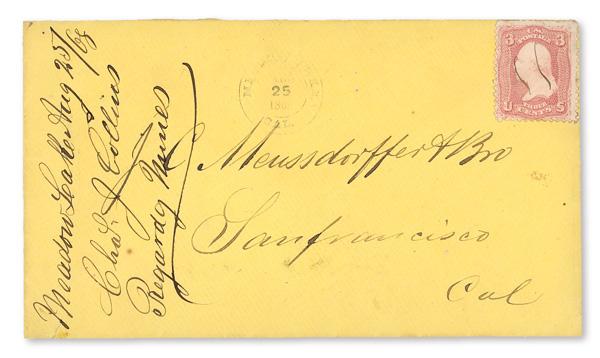 [California] Meadow Lake, yellow cover franked by 3¢ Washington, pen-cancelled, addressed to San Francisco; lightly struck town postmark of Aug. 25, 1868 a top center; docketing at left confirms town and date, plus "Chs. J. Collins/Regarding Mines"; small nick at bottom left, otherwise near-pristine, Very Fine, a scarce town marking. (Image)
