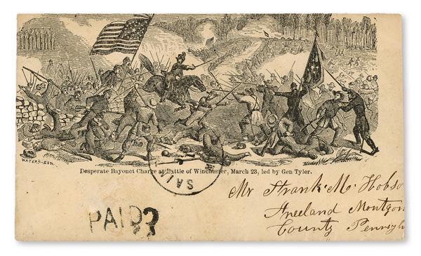 Desperate Bayonet Charge at Battle of Winchester, March 23, led by Gen Tyler, large all-over design on stampless cover with Saint Denis, Md July 1 postmark and straightline "PAID 3" handstamp, addressed to Freeland, Montgomery County, Pennsylvania; accompanied by enclosure datelined June 30, 1863, from Lieut. A.H. Kline noting the 138th Regiment "is at Harpers Ferry at present the Rebs is at South Mountain About fourty thousand strong whe expect a battal this weak" (original spelling) and requesting money be sent to his new wife at Baltimore; cover slightly reduced at right, otherwise sound, Fine to Very Fine. Bischel 1305. Walcott W-748 var. (Image)