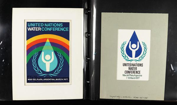Unadoped Drawings from the estate of artist and UN Stamp Designer Olav Mathiesen, approximately 200 items consisting of 30 stunning multicolor essays on board (maquettes in art-world lingo) including UN archive handstamps or artist signed on the reverse, many with plastic overlays, 45 preliminary paste-ups or drawings on either paper or card stock, 75-80 8.5 x 11 inch sheets of tracing paper with pencil designs including progressive essays (10 multicolor; rest black & white), plus 40 photos and a handful of UN publications or letterhead where Mathiesen's artwork was used, mostly 1970's and 1980's, many themes including Atomic Energy, Drug Abuse, Education, Fighting Racism, Human Rights, Hunger, Refugees & Peace, UNICEF, and Water, Very Fine, one of the designs shows a mother and baby, and this design was used in stamps of the UN, Togo and Liberia., this unique lot is fully imaged online. Sharp viewers will notice that while the stamp designs were rejected, certain design elements were used either in other UN stamps or in non philatelic areas. Purchased by the consignor from the Estate and offered here completely intact, although we have done some rearranging and reorganizing. Shipping charges apply - weight 35 lbs. (Video for this lot) (Video2 for this lot) (Video3 for this lot) (Video4 for this lot) (Video5 for this lot) (Video6 for this lot) (Video7 for this lot) (Video8 for this lot) (Image)