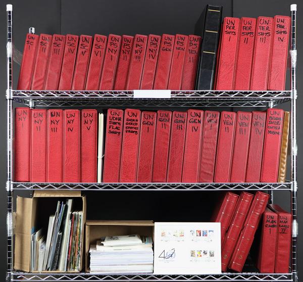 An Extremely Comprehensive and Complete UN Collection to 2024, consisting of collections of NY, Geneva & Vienna stamps and souvenir sheets & booklets plus sheets of Flags, Human Rights, & Endangered Species, Personalized Sheets including NY Nos. 853-857 with labels blank, NY 10th Anniversary of the Great Hanshin-Awaji Earthquake mint sheet folder, International Year of Microcredit 2005, Geneva UNPA 40th and Vienna WIPA 2008 & Essen 2009 complete imperforate sheets with first day cancels, NY, Geneva & Vienna Postal Stationery and Lettersheets mint and first day canceled, Offices of Overseas issues (Belgium, India, UNTEA & Kosovo) mint and first day cancelled, NY, Geneva & Vienna souvenir and maximum cards, and FDCs for Human Rights and Flag issues, most of the collections are complete to 2024, beautifully organized either on blank Lighthouse album pages or black vario stockpages in 39 red Lighthouse 3-ring binders with slipcases, plus a stockbook of modern UN imprint blocks, also includes NY, Geneva & Vienna, complete year and flag and similar sets in their original UNPA folders, an over 3 inch high stack of 10 x 7 inch cacheted UNPA official first day covers mostly with either singles or souvenir sheets of all NY, Geneva & Vienna issues affixed and canceled by the city's FD handstamp, and a 40th Anniversary of WFUNA card with all 3 souvenir sheets tied by FDCs and signed by the designers (No. 741/1000), Extremely Fine, most of the highlights are fully imaged online. Shipping charges apply - weight 267 lbs. (Video for this lot) (Video2 for this lot) (Video3 for this lot) (Image)