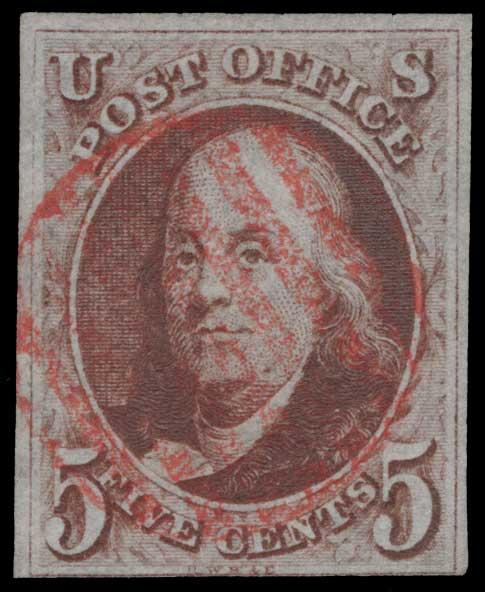 1847, 5c RED BROWN RED GRID CANCEL, #1, three ample margins, very close at bottom, tiny tear at top, fine, with 2026 P.F. cert., cat. $425.00 (Image)