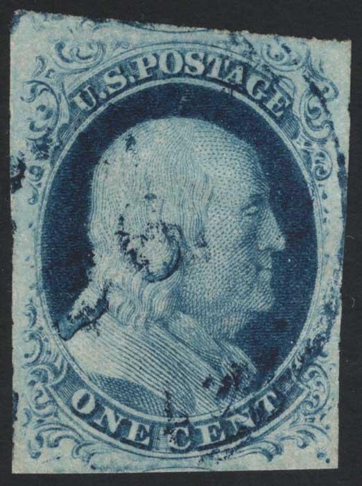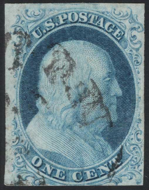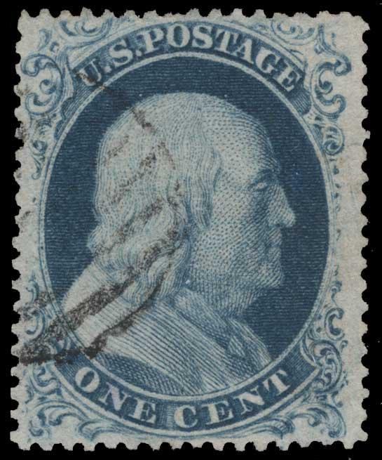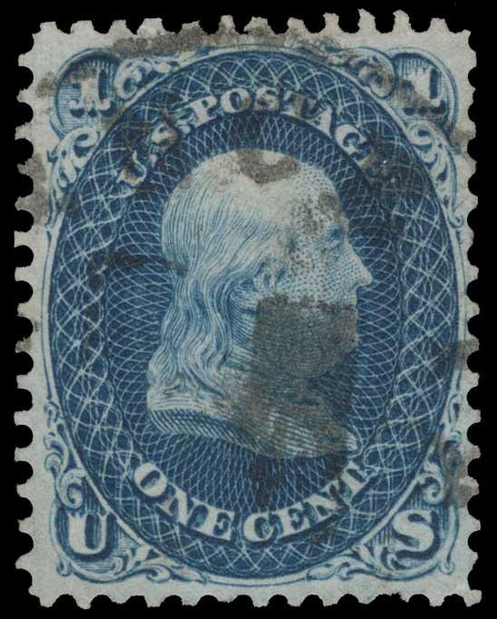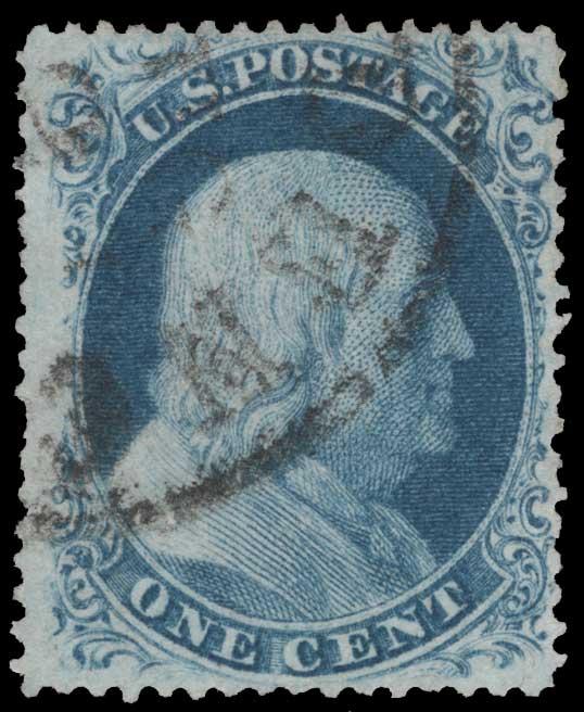 1861, 1c DARK BLUE USED, #63b, deep, blue shade, town cancel, single pulled perf., fine-very fine, with 2026 P.F. cert., very scarce shade, cat. $900.00 (Image)