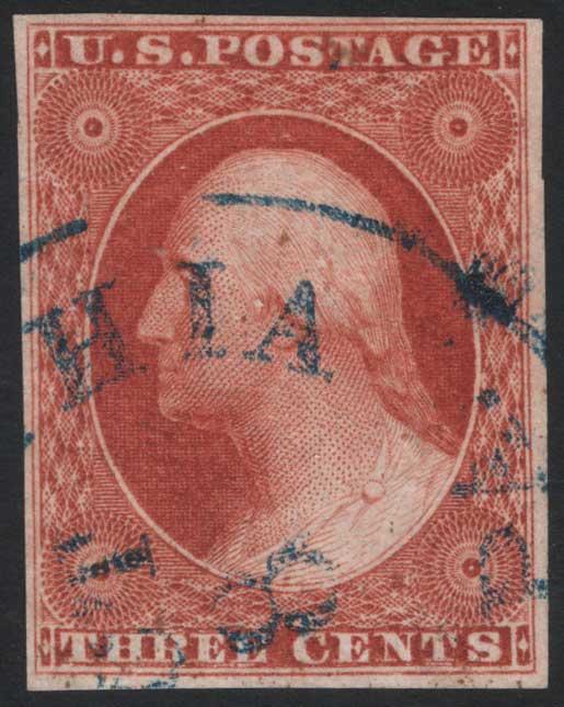 1851, 3c ORANGE BROWN TYPE I USED, #10, full margins, deep shade, blue Phila d.s., very fine - extremely fine, with 2026 P.F. cert. graded '85', cat. $200.00, SMQ $325.00 (Image)
