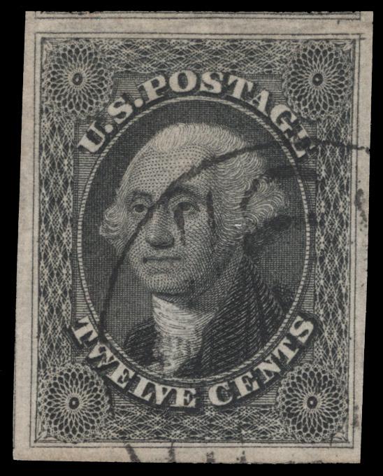 1857, 12c BLACK PLATE 1 PEN CANCEL, #36, well-centered, unobtrusive red pen cancel, very fine, lovely stamp, with 2026 P.F. cert. graded '80', cat. $160.00 (Image)
