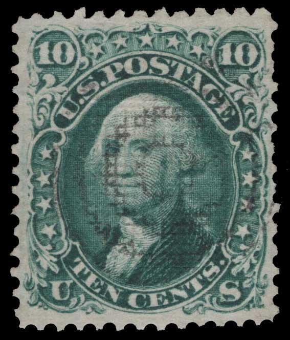 1868, 10c DARK GREEN 'F' GRILL USED, #96, quite well-centered, grid cancel, very fine, with 2026 P.F. cert. graded '80', cat. $275.00 (Image)