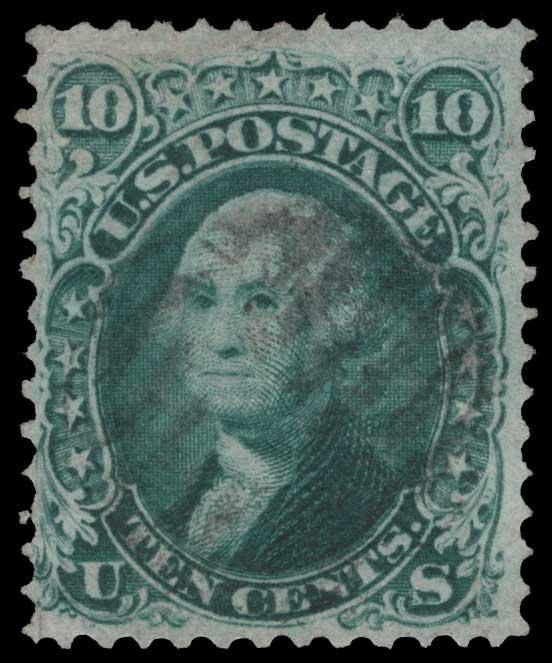 1857, 10c GREEN TYPE III USED GRADED '95', #33, exceptionally well-centered with full even perfs all around, town cancel, extremely fine - superb, a rare stamp in this superior condition, only three grade higher by PSE, SMQ $3,000.00 (Image)
