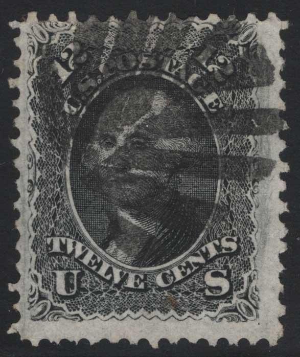 1868, 12c BLACK "F" GRILL USED, #97, fancy leaf cancel, slight diagonal crease at bottom left, fine-very fine, with 2026 P.F. cert., cat. $260.00 (Image)