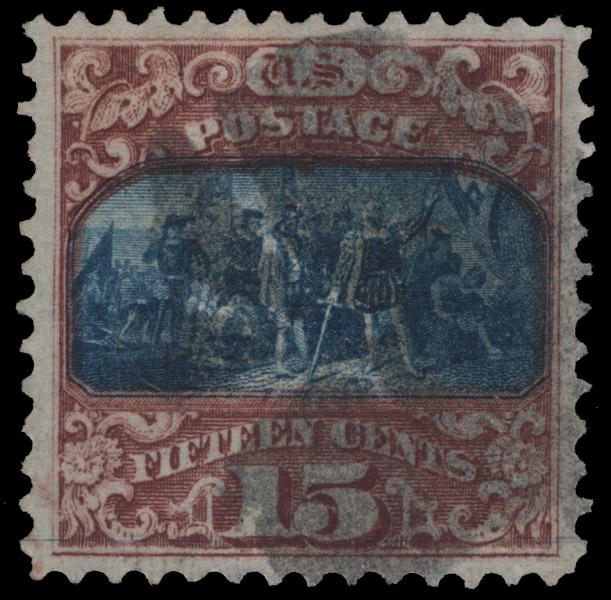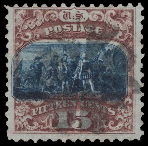1869, 15c BROWN & BLUE TYPE II USED GRADED '90', #119, beautifully centered, fairly light cork cancel leaving the design visible, extremely fine, with 2022 PSE cert. graded '90', SMQ $650.00 (Image)