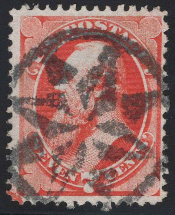 1871, 7c VERMILION "I" GRILL WITH N.Y.F.M. CANCEL, #138A, distinct impression of the cancel neatly offset by the vermilion color, very fine, scarce grill, with 2026 P.F. cert., cat. $800.00 (Image)
