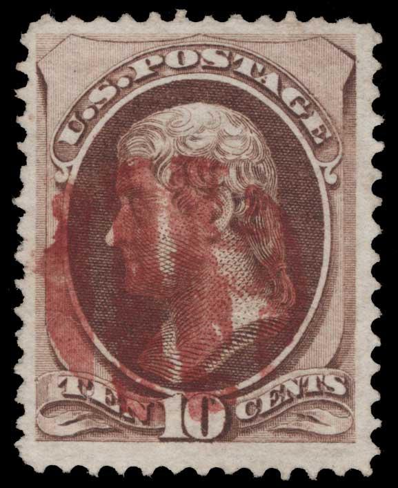 1870, 10c BROWN "H" GRILL WITH RED CANCEL, #139, well-centered, very fine, with 2026 P.F. cert. graded '80', cat. $950.00 (Image)