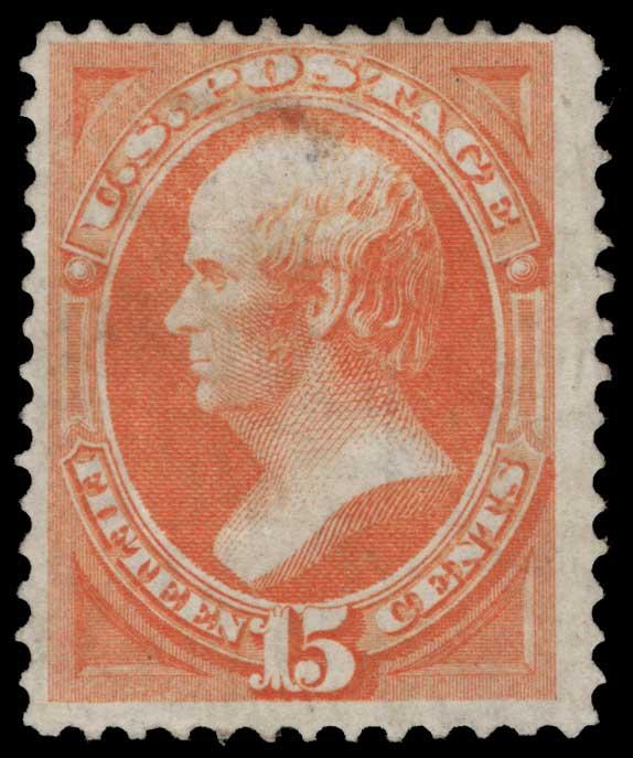 1870, 15c ORANGE "H" GRILL MINT, #141, vibrant color, well-defined grill for this issue, part redistributed original gum, small thin, small hum stain on Webster's head, fine-very fine, with 2019 William T. Crowe cert, very scarce mint grilled issue, cat. $7,500.00 (Image)