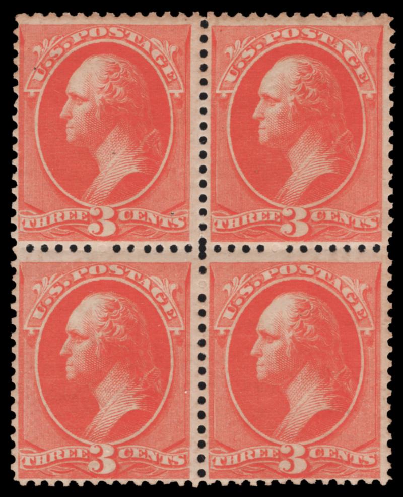 1887, 3c VERMILION BLOCK NH, #214, fresh, tiny pinhole in top left stamp, fine-very fine, cat. $760.00 (Image)