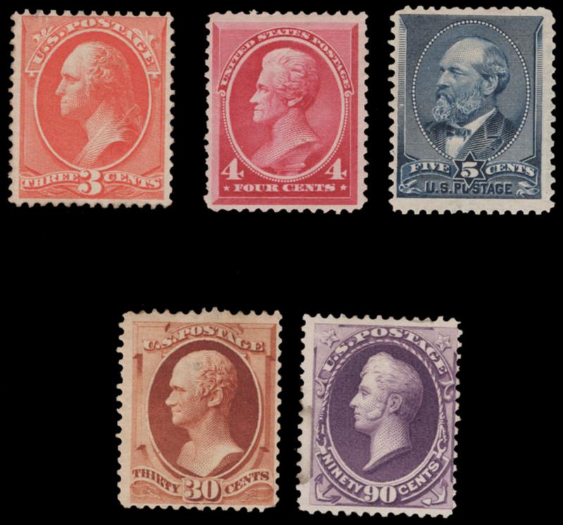 1887-88, 3c-90c BANK NOTE ISSUES UNUSED/MINT, #214-18, 3c, 30c and 90c regummed, 4c o.g., tiny thin spot, 5c o.g., 5c, 30c and 90c also reperfed, great colors though, cat. $765.00 (Image)