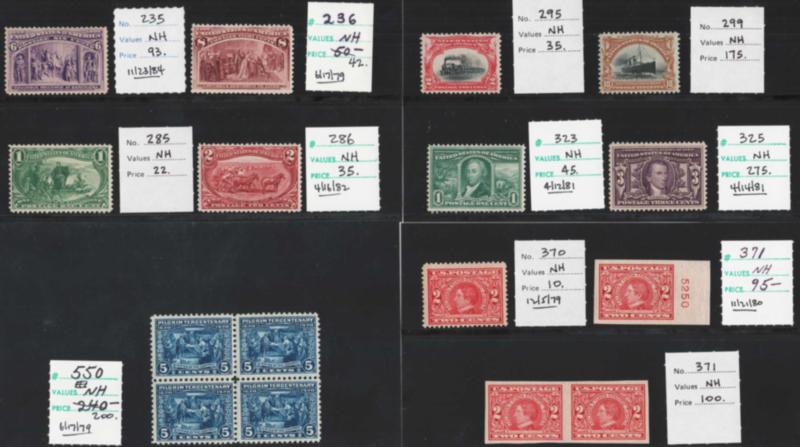 US 1893-1920 HAND-PICKED COMMEMORATIVES MINT NEVER HINGED, incl. nos. 235, 236, 285, 286, 295, 299, 323, 325, 370, 371 plate single and pair, 550 block, from and old dealer's stock with tags indicating individual pricing form 1979-84, very fine - extremely fine, current cat. $1,397.50 (Image)