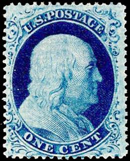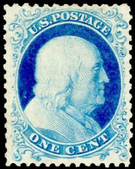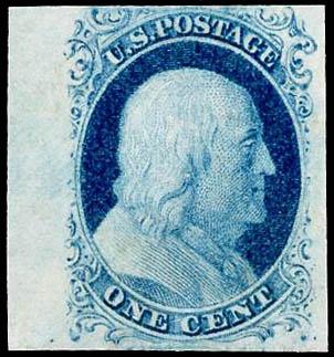 1857-60 (1875 Reprint), 1¢ bright blue (40). Without gum as issued, flawless centering within wide margins, brilliant color and paper, Extremely Fine, a choice gem, only one graded higher by the PF and one by the PSE with no 100s. SSV $1,750 (SMQ $1,900), only 3846 sold (photo). $650
