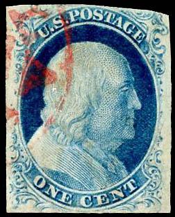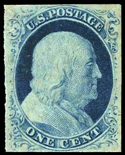 1851, 1¢ blue, type Ib (5A). Top margin single, position 8R1E, three clear to large margins, in at left, lightened CDS cancel, vivid color, V.G., bright and fresh example of this, one of the two best examples of this rare type (photo). $11,000
