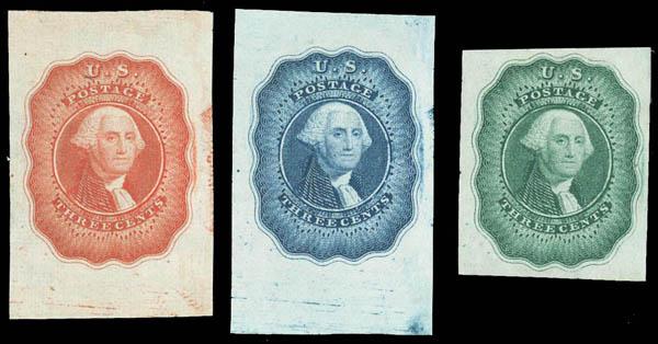 1851, 3¢ Washington essay, by Toppan, Carpenter, Casilear & Co. (11-E18A). Three different colors, scarlet, blue green, blue, fresh and choice, Very Fine (photo). Estimate 200 - 300 US$200-300 (Image)