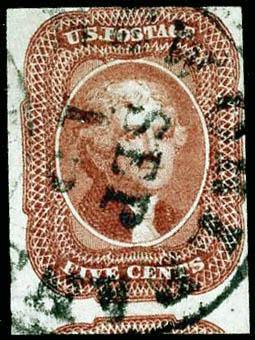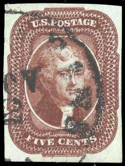1856, 5¢ red brown (12). Large balanced margins, deep rich color on bright paper, neat New Orleans town cancel, Extremely Fine. SSV $875 (SMQ $850)(photo). $750