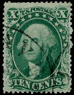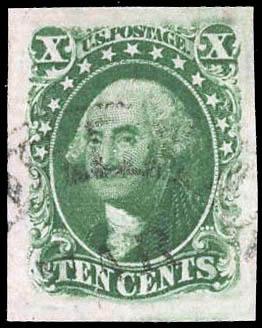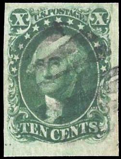 1855, 10¢ green, type I (13). Large to huge margins including part sheet margin at bottom allowing the important type characteristics to be fully visible, rich color, neat grid cancel, Extremely Fine, a choice used type I 1855 10¢. SMQ $1,500(photo). $750