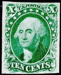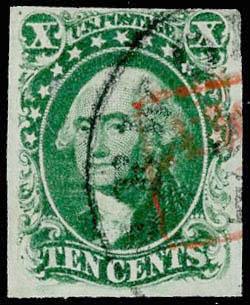 1855, 10¢ green, type I (13). Margins virtually all around, removed pen cancel, bright color, Very Fine, handsome unused appearance (photo). $375 US$0 (Image)
