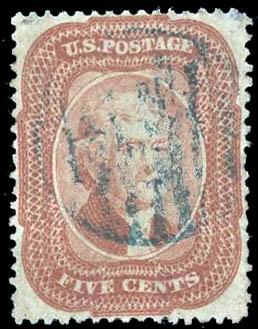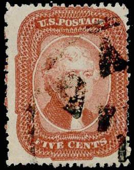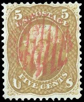 1861, 5¢ buff (67). Beautiful intense shade with pretty bright red grid cancel, sharp impression, F.-V.F. great eye appeal (photo). $810