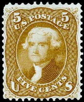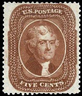 1861, 5¢ buff (67). Unused without gum, rich color, sharp impression, attractive centering, few slightly blunted perfs at left, not mentioned in certificate, fresh F.-V.F., a handsome example of the rare unused 5¢ buff (photo). $12,500 for no gum