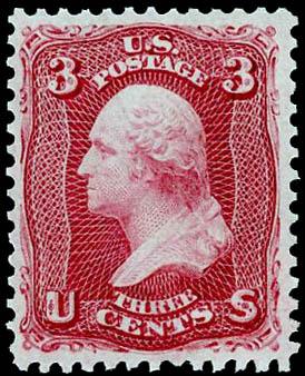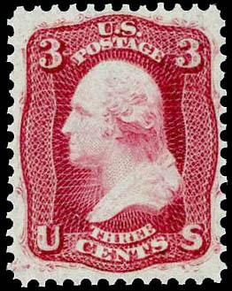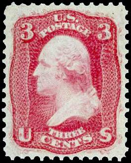 1861, 3¢ lake (66). Original gum never hinged, quite well centered, rich prooflike color and impression, Very Fine, exceedingly rare never hinged— there have been no examples certified as never hinged by the Philatelic Foundation since they began using the "never hinged" modifier in 1994. Now listed as 66T6 (photo). $2,000 as hinged