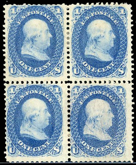 1861, 1¢ blue (63). Block of four. Original gum light hinge remnant, bright color, few tiny perf faults on top left stamp, Fine (photo). $1,600 US$0 (Image)