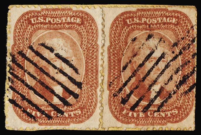 (27) Two singles on piece, HC, dark color, SP's, trimmed perfs at R. on the right stamp, F.Scott $ 2,900 Certificate: 2025 Crowe (Image)