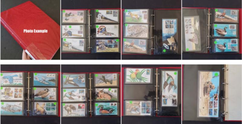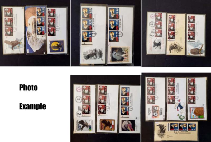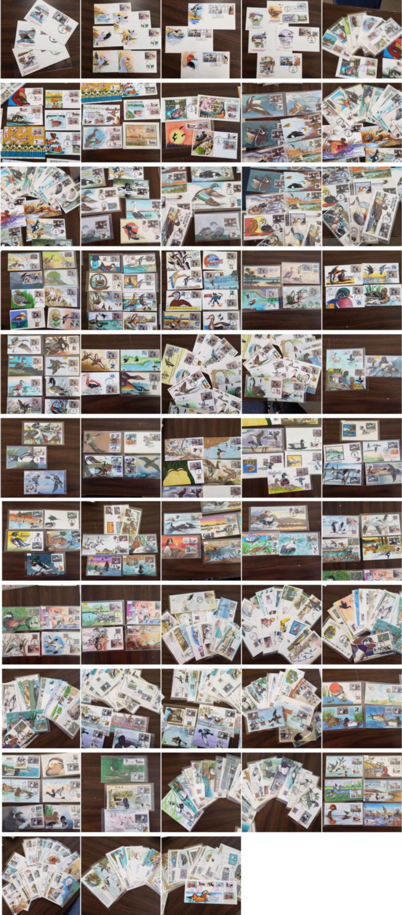 EXTENSIVE HANDPAINTED FEDERAL DUCK STAMP FIRST DAY COVER COLLECTION, this incredible collection of 423 DIFFERENT handpainted FDC's features dozens of different designers and a range of years from 1983 to 1999, mostly loose in a box but virtually all are in plastic or poly sleeves, the overall condition is very, very nice with maybe only a few scattered faults, the collection by years include of all different artists: 1983(5 Different), 1984(24), 1985(46), 1986(29), 1987(38), 1988(39), 1989(86), 1990(66), 1991(32), 1992(6), 1993(7), 1994(10), 1995(9), 1996(2), 1997(2), 1998(3), 1999(3); please note that some artists had different designs for the same years, the general retail on Duck FDC's is in the $20-30 range but for handpainted covers the retail value jumps up to the $50-75 range depending on the artist, many scarcer covers retail in the $100-300 range, this collection is the most extensive handpainted Federal Duck FDC collection we have ever seen, a truly amazing group of covers not to mention the stunning multi-colored designs and unique artwork attributed to the dozens of artists who worked on this are over the years, we have scanned a number of covers but seeing this massive collection in person is an incredible treat, our estimate of the retail value of this collection is easily in the $30,000-40,000 range and just the time and expensive of seeking out these covers over many years would cost thousands of dollars in time and expense, it is our pleasure to offer this collection intact as received.