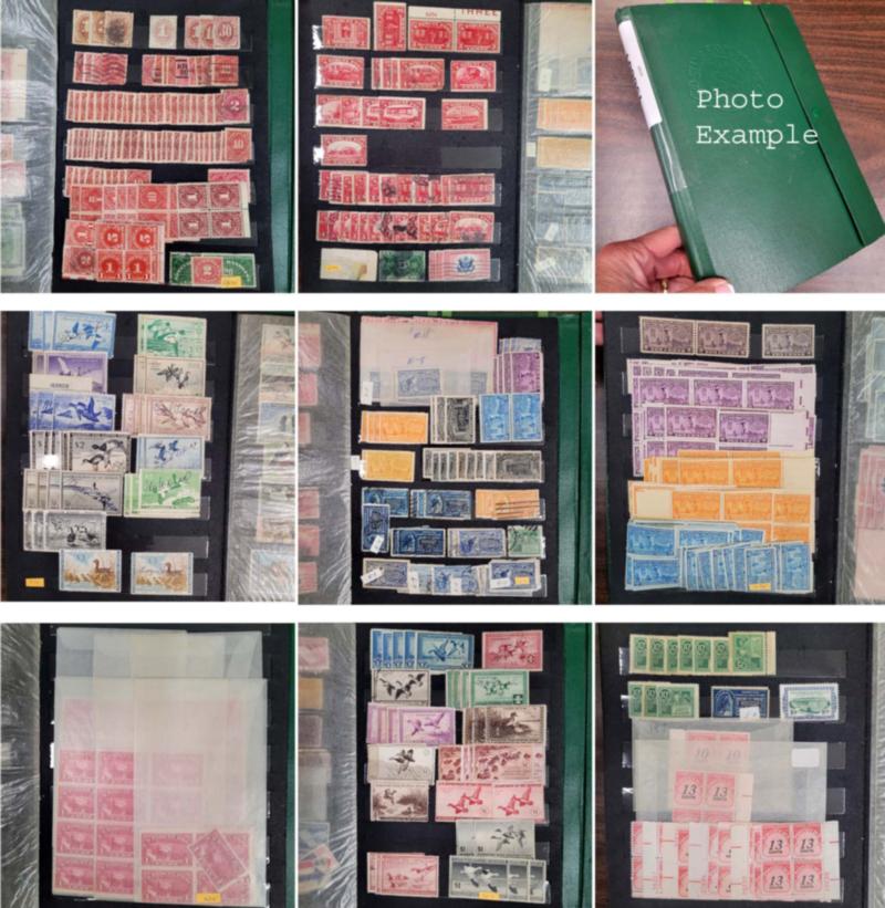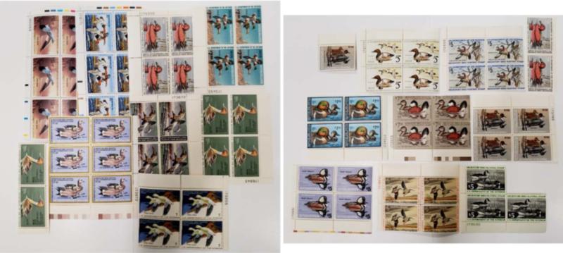 U.S. AND STATE DUCK STAMP INVENTORY, includes several hundred mixed mint, unused, signed, blocks, plate blocks, panes and S/S's, contained in five counter books, three of which are Federal Ducks ($56k cat.) and two with State Ducks ($11k cat.), starts with RW1 and runs through RW87, also includes a nice section of Junior Ducks, there is a good balance of mint NH, H, unused and signed throughout the Federal section, there are also a good number of plate number singles and several dozen plate blocks in the later issues, also there are some of the early issues on Licenses, most of the State issues are mint, quantities generally range from 1-5 each condition with some higher, displayed, cataloged and priced on retail pages, the catalog values are a few years old, the overall condition is mixed and there are faults here and there but also many Very Fine or better stamps here and it is quite likely there are many that could be graded which would enhance this lot significantly about the catalog value listed here, pretty much ready to go and certainly a huge amount of total retail value .