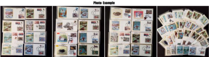 EXTENSIVE HANDPAINTED FEDERAL DUCK STAMP FIRST DAY COVER COLLECTION , this amazing collection of 166 DIFFERENT handpainted FDC's features dozens of different designers and a range of years from 1983 to 1999, this collection is similar to the much large one offered elsewhere in this section but all the lots in this group are in the larger collection, mostly loose in a box but virtually all are in plastic or poly sleeves, the overall condition is very, very nice with maybe only a few scattered faults, the collection by years include of all different artists: 1983(4 Different), 1984(11), 1985(14), 1986(10), 1987(16), 1988(20), 1989(34), 1990(26), 1991(14), 1992(1), 1993(3), 1994(6), 1995(4), 1996(2), 1999(1); please note that some artists had different designs for the same years, the general retail on Duck FDC's is in the $20-30 range but for handpainted covers the retail value jumps up to the $50-75 range depending on the artist, many scarcer covers retail in the $100-300 range, a truly amazing group of covers not to mention the stunning multi-colored designs and unique artwork attributed to the dozens of artists who worked on this are over the years, we have scanned a number of covers but seeing this massive collection in person is an incredible treat, our estimate of the retail value of this collection is easily in the $10,000-15,000 range and just the time and expensive of seeking out these covers over many years would cost thousands of dollars in time and expense.