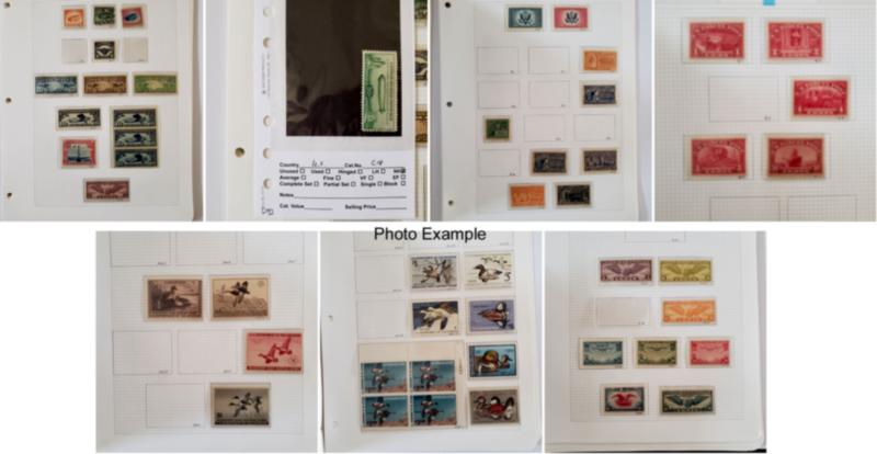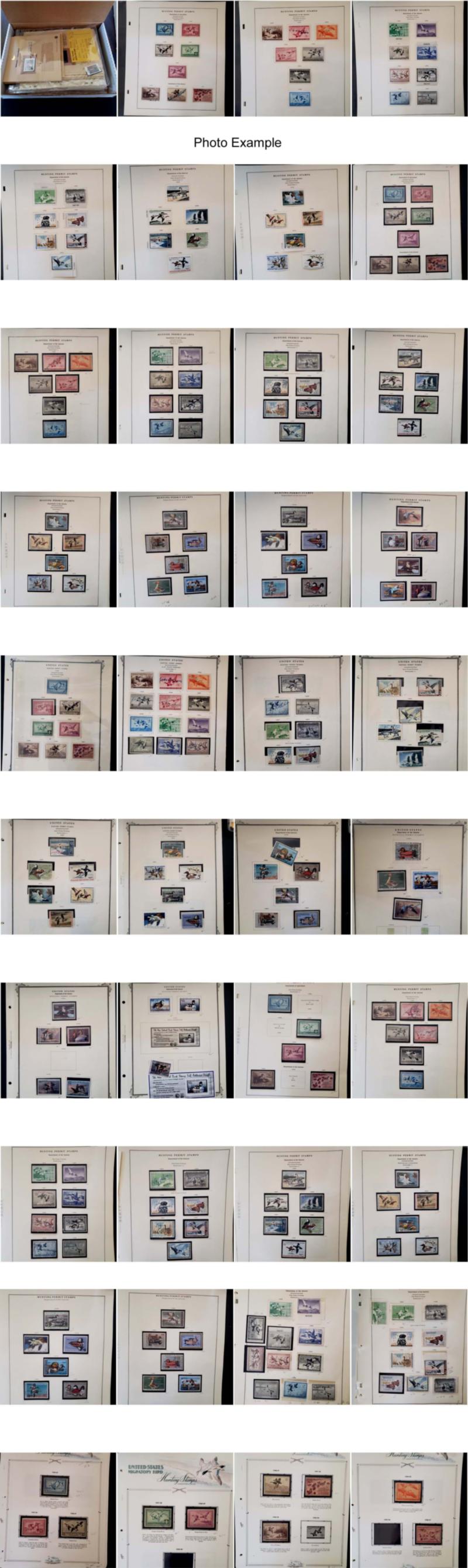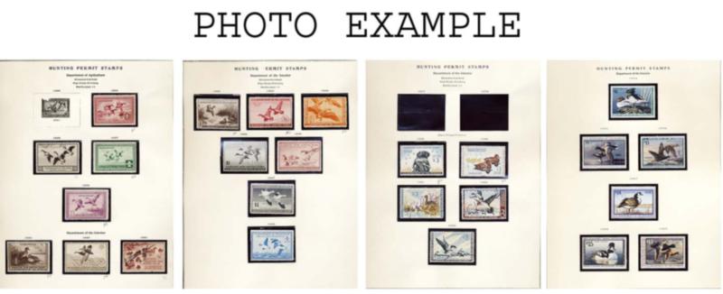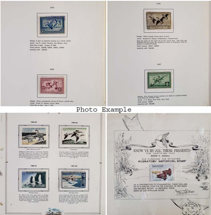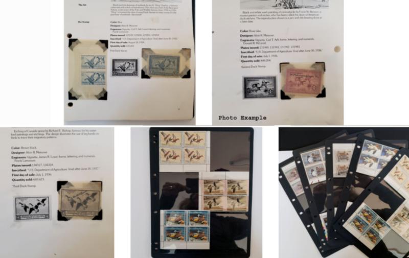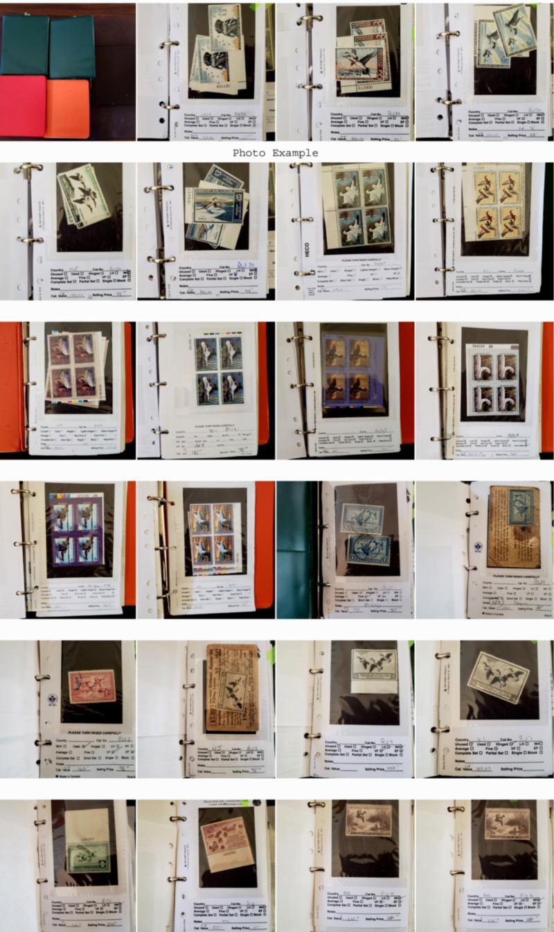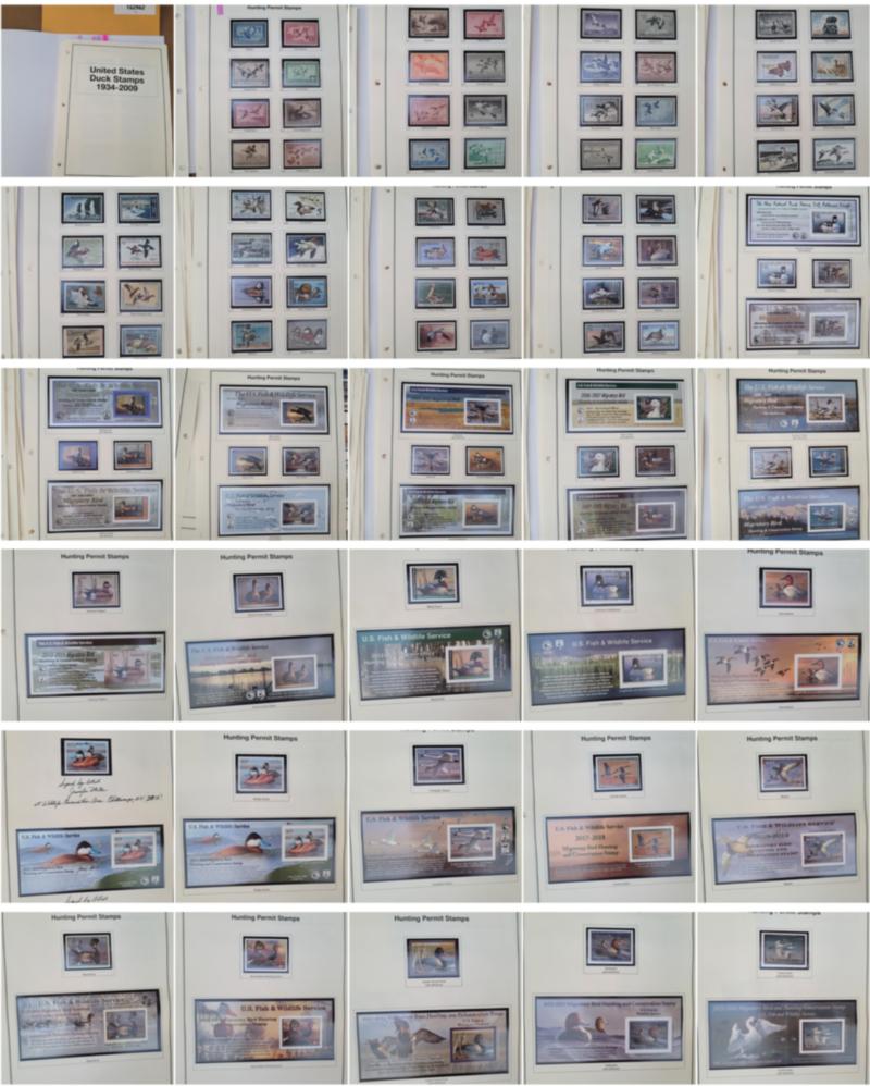 U.S. STATE AND FEDERAL DUCK COLLECTIONS GROUP, includes 12 various U.S. Duck stamp collections on album pages contained in clear plastic holders and in a large flat white box, these collections generally contain mint and used, many collections are all different, the overall condition of this group is mixed and faults are to be expected, there is some duplication to be expected, most have a total catalog value and they range from about $700 to $4,400 each, the catalog value years can range over many different years so the current catalog value is certainly more than the total listed here, there are nine Federal Duck Stamp collections with most cataloging over $2,000 each, there is also three State Duck collections included but only account for about $1,000 in value, the catalog value listed is for those collections which have been cataloged, most of these collections are ready to go for the retail dealer or internet sales.