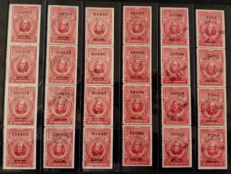 DATED REDS SIX DIFFERENT INTACT PANES OF FOUR, all are used, HC's, MC's, CC's or SH's, all six panes are $1,000 denominations, displayed on a black stock page, the group includes: R335, 435, 460, 510, 560 and 616, mostly Very Fine or better, certainly a very scarce group of high values, the catalog value is for singles with no premiums for the panes.