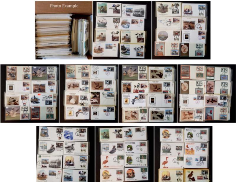 FEDERAL DUCK STAMP FDC ACCUMULATION, includes over 260 various First Day Covers, all have Federal Ducks and some have combo usages, all are cacheted and virtually all are unaddressed, the overall condition is very clean, there is duplication but also amazing variety, many different years here but primarily in the 1981-90 period with a few later, many of these covers retail in the $50-75 range and most are over $30, the total retail value of this group would be well over $10,000, a huge number of covers from this always popular area.