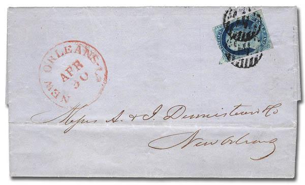 1851, 1¢ Franklin, blue, type II (Scott 7), deep shade, used on a neat New Orleans folded letter, Fine to Very Fine. Scott $175. Estimate $60 - 80. Scott $175 Suggested Bid $60-80 (Image)