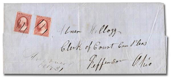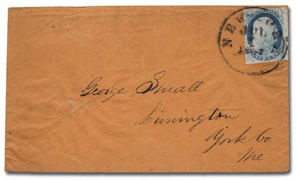 1851, 3¢ Washington, orange brown, type I and 1852, 3¢ Washington, dull red, type I (Scott 10, 11), a rare combination used on one cover, Fine to Very Fine. Scott $278. Estimate $100 - 150. Scott $278 Suggested Bid $100-150 (Image)