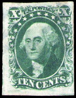 1855, 10¢ Washington, green, type III (Scott 15), 4 nice margins, unused without gum; a light crease, otherwise almost Very Fine. Scott $1,800. Estimate $250 - 350. Scott $1,800 Suggested Bid $250-350 (Image)