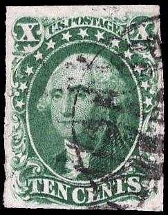 1855, 10¢ Washington, green, type II (Scott 14), 4 ample to huge margins, faintly canceled, Very Fine. Scott $145. Estimate $100 - 150. Scott $145 Suggested Bid $100-150 (Image)