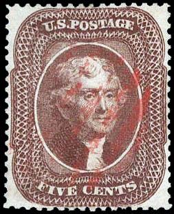 1860, 5¢ Jefferson, brown, type II (Scott 30A), magnificent centering, red grid cancel; a tiny filled thin at bottom right, beautiful Extremely Fine appearance, with 2025 P.F. certificate. Scott $395. Estimate $150 - 200. Scott $395 Suggested Bid $150-200 (Image)