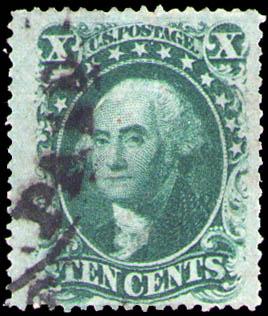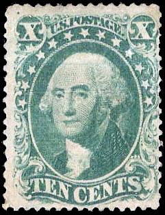 1859, 10¢ Washington, green, type V (Scott 35), choice, Very Fine to Extremely Fine. Scott $55. Estimate $60 - 80. Scott $55 Suggested Bid $60-80 (Image)