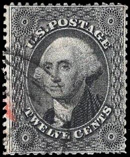 1857, 12¢ Washington, black, plate I (Scott 36), black and red cancels; reperfed at bottom, otherwise nearly Fine, with photocopy of 2005 P.F. certificate. Scott $345. Estimate $50 - 75. Scott $345 Suggested Bid $50-75 (Image)