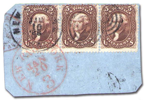 1863, 5¢ Jefferson, brown (Scott 76), horizontal strip of 3, centered to top, tied on piece with black New Orleans target cancel, red New York and black French transit cancels, nearly Fine, with 2025 P.F. certificate. Scott $420. Estimate $80 - 120. Scott $420 Suggested Bid $80-120 (Image)
