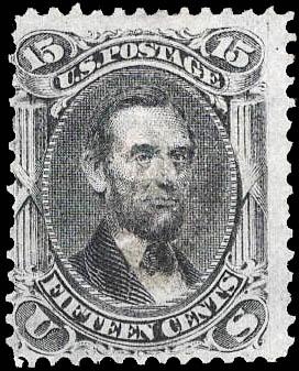 1866, 15¢ Lincoln, black (Scott 77), lightly canceled; small thins, Fine appearance. Scott $225. Estimate $40 - 60. Scott $225 Suggested Bid $40-60 (Image)
